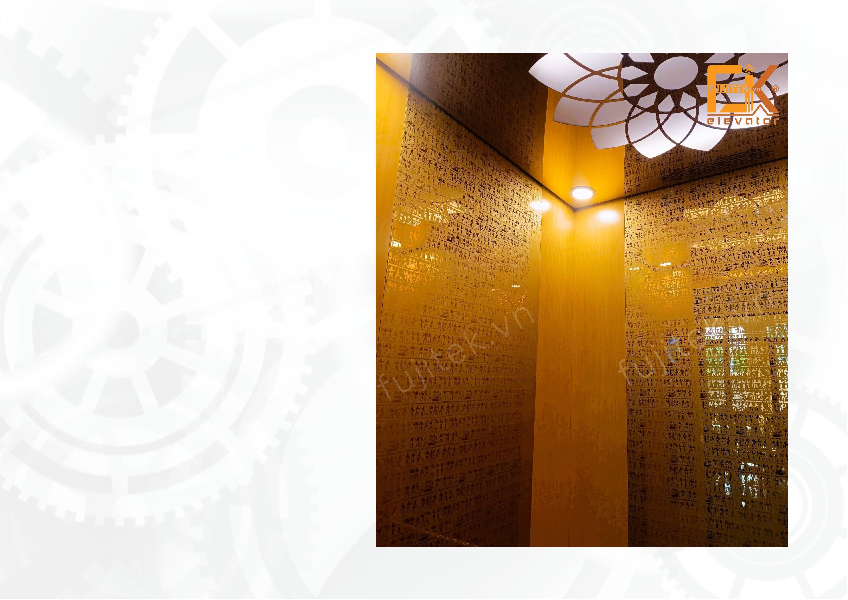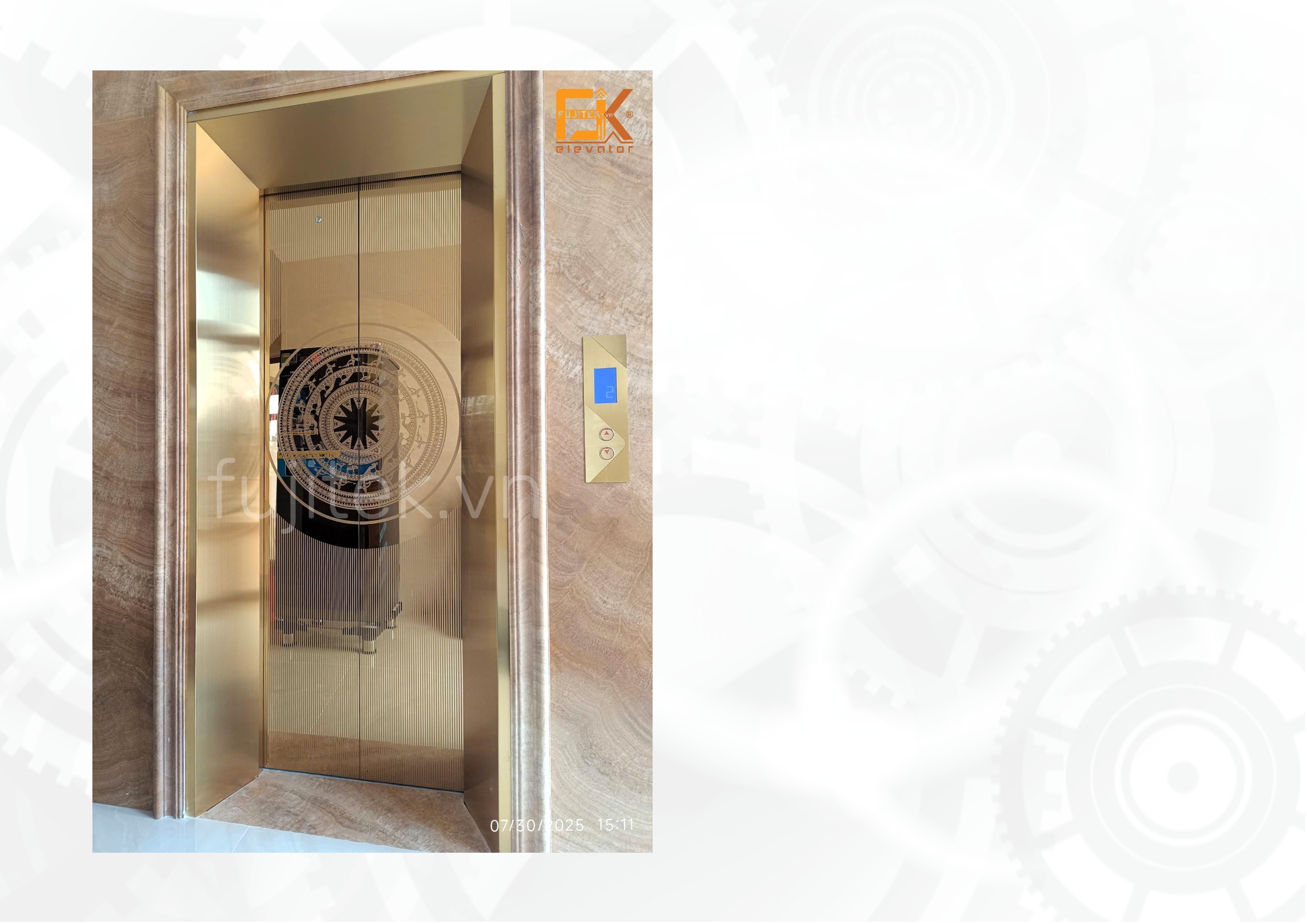 - Vật liệu trang trí chủ đạo : Laminate vân gỗ xen kẽ Inox vàng hoa văn ở giữa.